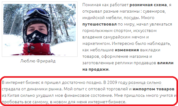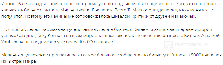 Также на сайте Ковпака указано, что бизнес Китаем пошел успешно, после чего он решил запустить обучение. Однако, еще недавно в разделе «Моя история» Дмитрий писал, что бизнес с Китаем сильно ухудшил его финансовое состояние.