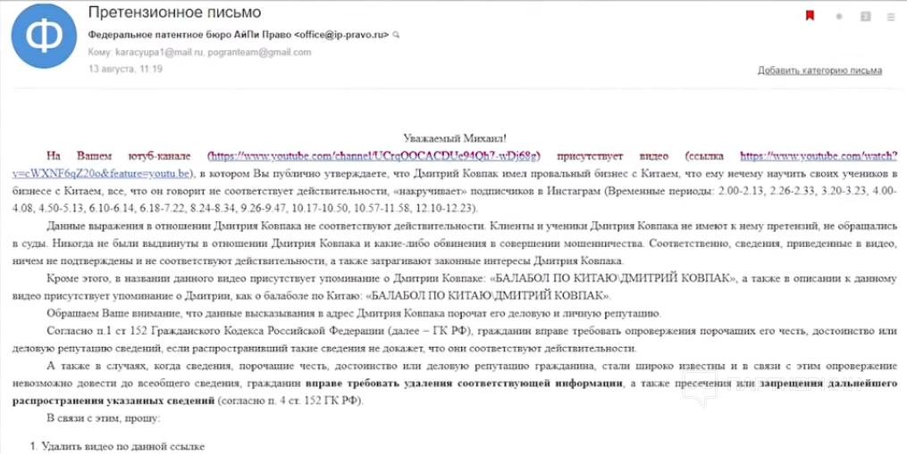 Ковпаку разоблачение Пограничника с обидным названием не понравилось и он через юриста обратился к блогеру с досудебной претензией.