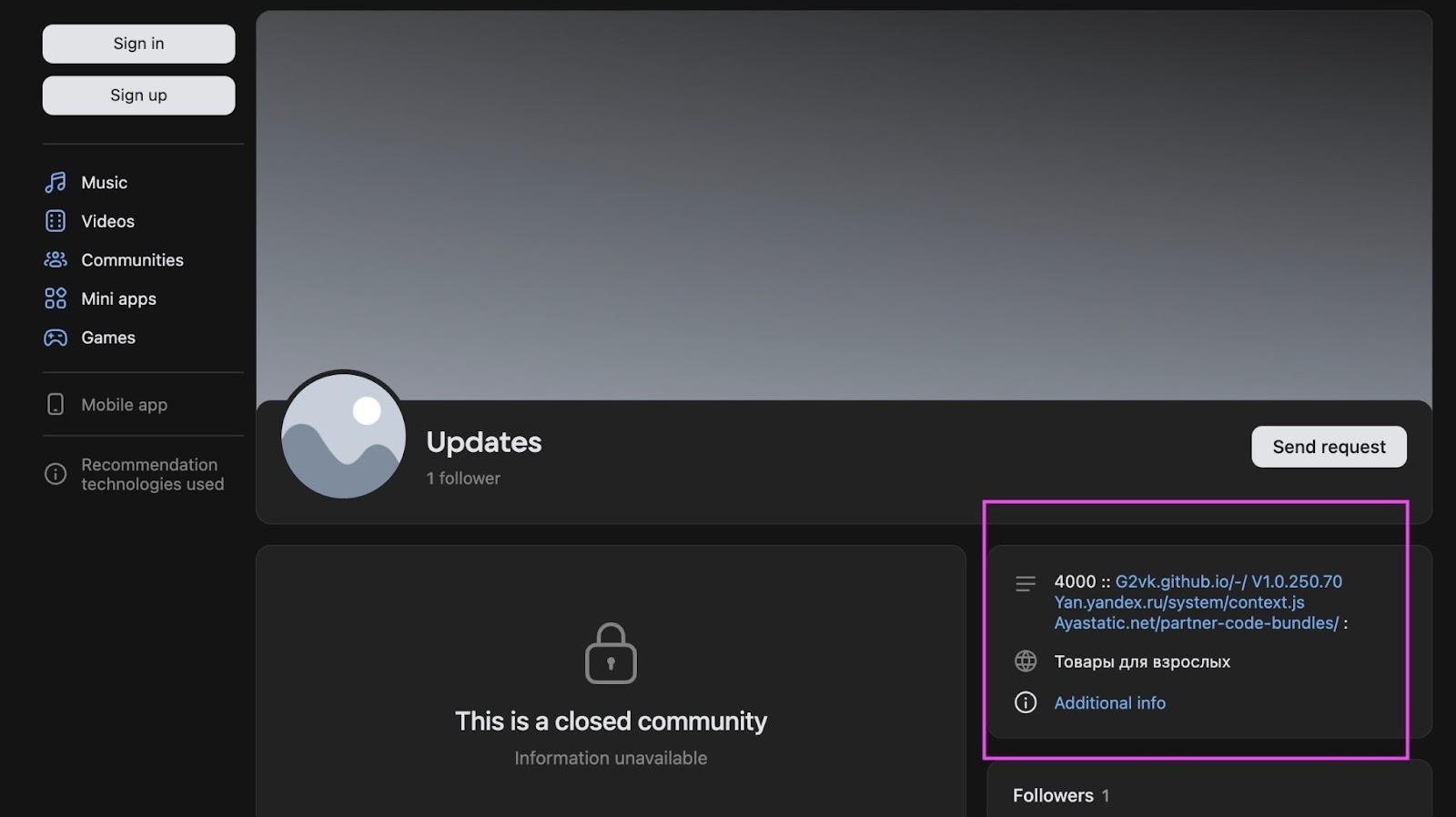 Так, с вероятностью 75% при каждом визите жертвы в VK вредонос подписывал ее на группу злоумышленника — VK Styles (VK -168874636), в которую входят 1,4 млн участников. То есть жертвы вносили свой вклад в «рекламу» вредоноса, а друзья пострадавшего видели подписку и тоже начинали доверять расширению. К тому же даже в случае отписки от группы сохранялся 75% шанс, что малварь повторно подпишет жертву.