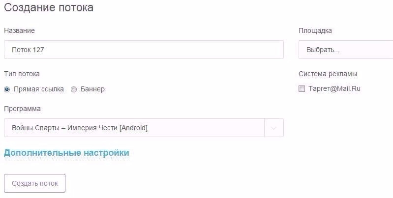 9. Название вводим любое, выбираем площадку, нажимаем Создать Поток.