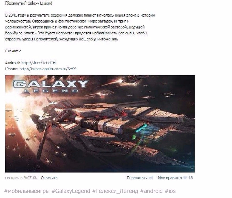В данном примере мы скомбинировали метки: общие #мобильныеигры #ios и конкретные #GalaxyLegend #Гелекси_Легенд