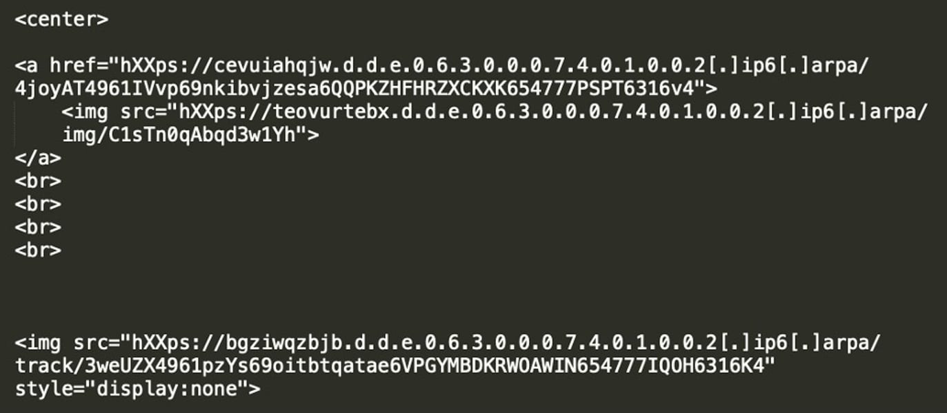 Вредоносная ссылка встроена в изображение и использует hostname из зоны ip6.arpa в качестве URL (к примеру, d.d.e.0.6.3.0.0.0.7.4.0.1.0.0.2.ip6.arpa), так что пользователь не видит подозрительного hostname в привычном понимании. После клика жертву направляют в TDS (Traffic Distribution System), который фильтрует цели по типу устройств, IP-адресам, рефереру и другим параметрам. Прошедших проверку жертв перенаправляют на фишинговый сайт, остальных — на легитимный ресурс.