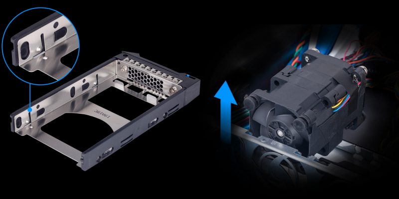 В случае S12-P04S это 4 × 3,5” SATA-3 c возможностью горячей замены + фиксированных 2 × 2,5” SATA-3 без таковой, а у S12-P10R — 10 × 2,5” SATA-3, все с горячей заменой. Обе модели также имеют на плате слот M.2 2280/2260 (PCIe 3.0 x4) для установки быстрого загрузочного накопителя. На плате имеется встроенный RAID-контроллер для SATA-накопителей, который можно настроить в BIOS/UEFI. Никаких дополнительный лицензий или ключей (как, например, ключ Intel vROC, который необходим исключительно для массивов из NVMe-накопителей) для его работы не требуется.