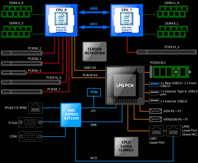 Основной платформы является плата C621-SD8 на чипсете Intel C621, которая рассчитана на установку двух LGA3647-процессоров Intel Xeon Scalable первого и второго поколений. Плата не самая новая, но её возможностей вполне достаточно. Каждому процессору полагается по четыре слота для модулей памяти DDR4-2133/2933 ECC (L)RDIMM суммарной ёмкостью до 1 Тбайт. Процессоры накрываются воздуховодом, перед которым стоит блоки из четырёх вентиляторов с ШИМ. Ещё один вентилятор обдувает область слотов PCIe.