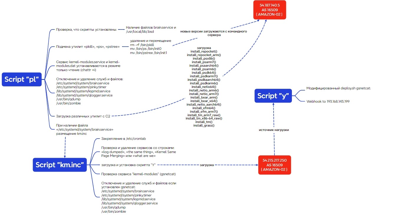 Общая схема работы скриптовПомимо этого, группировка сохраняет доступы к атакованным серверам, что в теории позволяет проводить и более сложные атаки. То есть группа может представлять угрозу для сотен, если не тысяч компаний, в том числе в России.