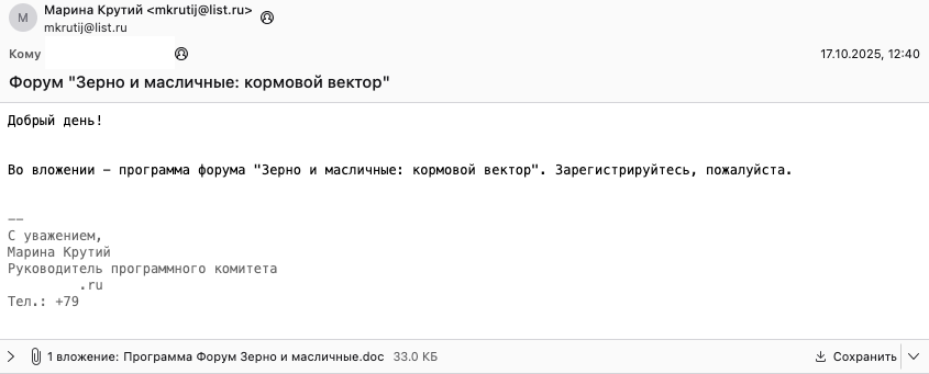В качестве приманки атакующие использовали программу агропромышленного форума «Зерно и масличные 2025: кормовой вектор», который пройдет 30 октября 2025 года в Москве.