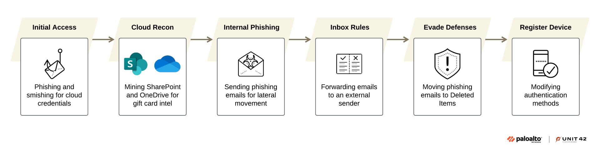 Атаки группировки высоко таргетированы. Сначала хакеры проводят разведку, а затем отправляют своим целям ссылки на фишинговые страницы по электронной почте или SMS. Если сотрудник попадается на уловку мошенников, они похищают учетные данные от Microsoft 365 и проникают в сеть компании. Далее злоумышленники изучают SharePoint и OneDrive жертвы в поисках информации о процессах выпуска и отслеживания подарочных карт, о бизнес-операциях, финансовых процессах, конфигураций VPN, гайдов по доступу и других ИТ-процессах.