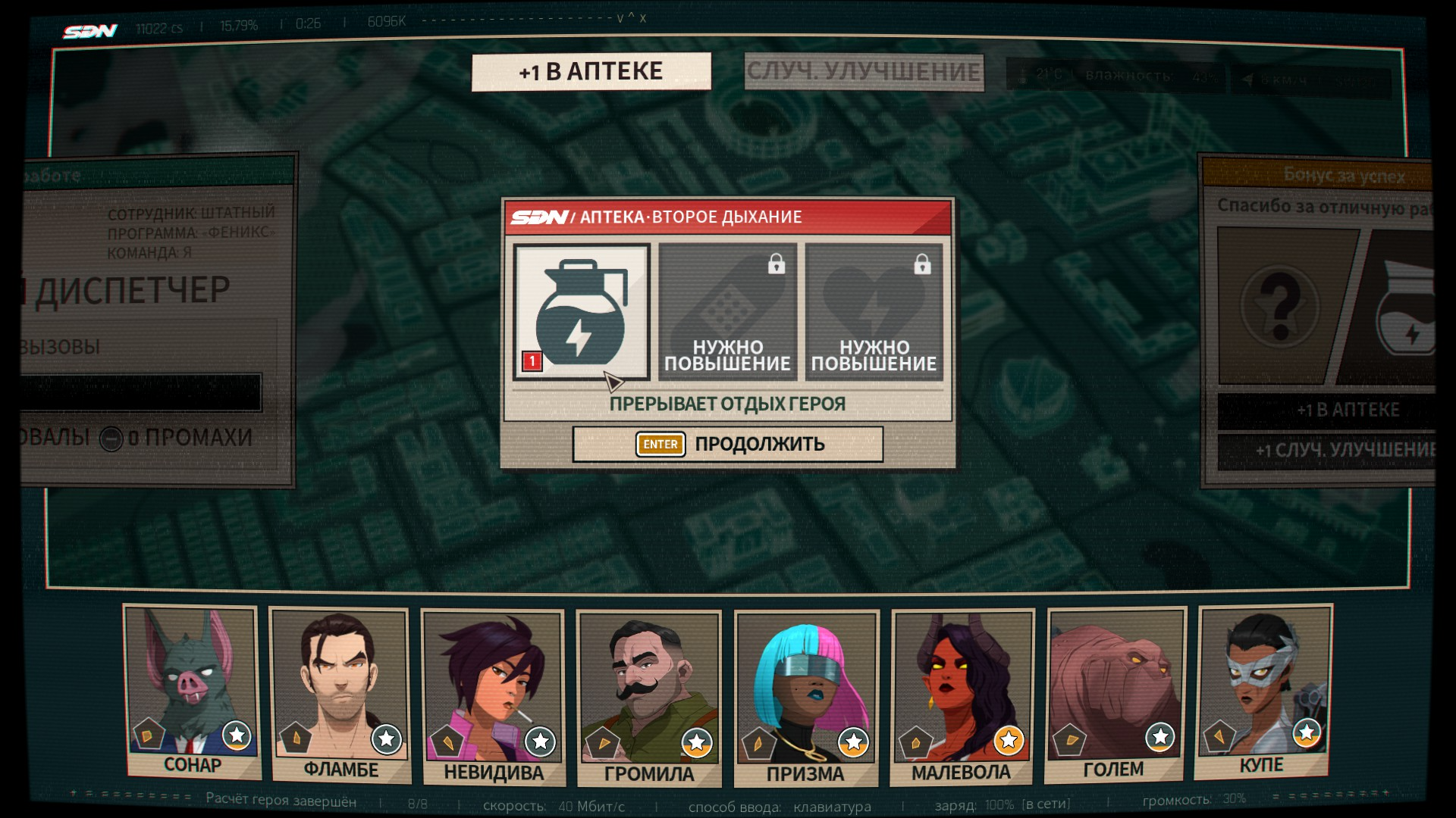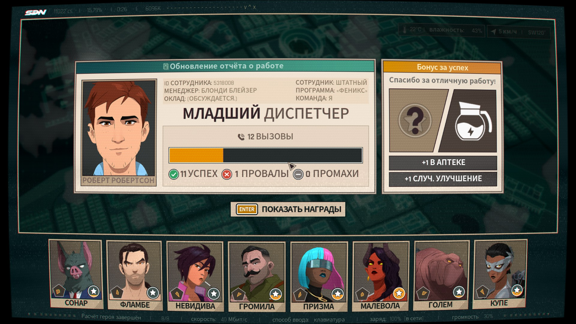 Вторая часть — отправление отрядов на выполнение заданий. Тут это выполнено в традициях дилогии This Is the Police. И, если честно, не хватило Dispatch случайных событий в духе: герой, символ спокойствия, пропускает смену по причине жестокого бодуна и в таком духе. Да, могут кинуть камень в огород, мол, они же на карандаше, т. к. бывшие преступники! Ну да, только одной из них это не помешало дать герою по лицу на рабочем месте. Видно, что персонажи фактурные, но кроме внешности и способностей это толком не выражается.