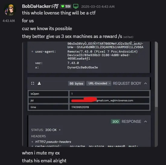 «Все началось с того, что я использовал приложение Lovense и поставил кого-то в мьют. Это все. Я просто использовал mute, — пишет BobDaHacker. — После этого я увидел ответ API и подумал... подождите, это что, адрес электронной почты? Почему он здесь? Копнув глубже, я понял, что можно превратить любое имя пользователя в email-адрес».