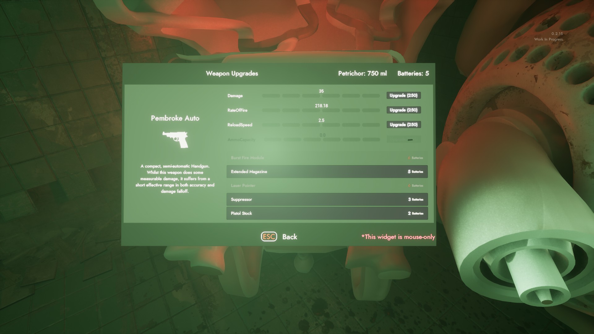 Прокачка оружия происходит в специальном терминале, для прокачки используются материалы петрикор и батарейки. Первый используется для увеличения урона и скорострельности, а вторые — для покупки модулей, например глушителя или приклада. И если с прикладом ещё понятно, то как будет работать глушитель, пока неясно, потому что враги выдерживают три-четыре выстрела и, при получении урона, оповещают всех на локации, указывая, куда им нужно бежать.