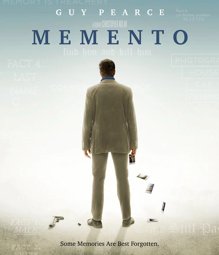 Главный герой страдает редкой формой амнезии и запоминает события лишь на несколько минут. Чтобы найти убийцу жены, он фиксирует подсказки на фотографиях и собственном теле. Повествование выстроено фрагментарно и движется в обратном порядке, превращая просмотр в сложную интеллектуальную задачу. Зритель, как и персонаж, вынужден сомневаться в каждом факте и самостоятельно восстанавливать картину происходящего.