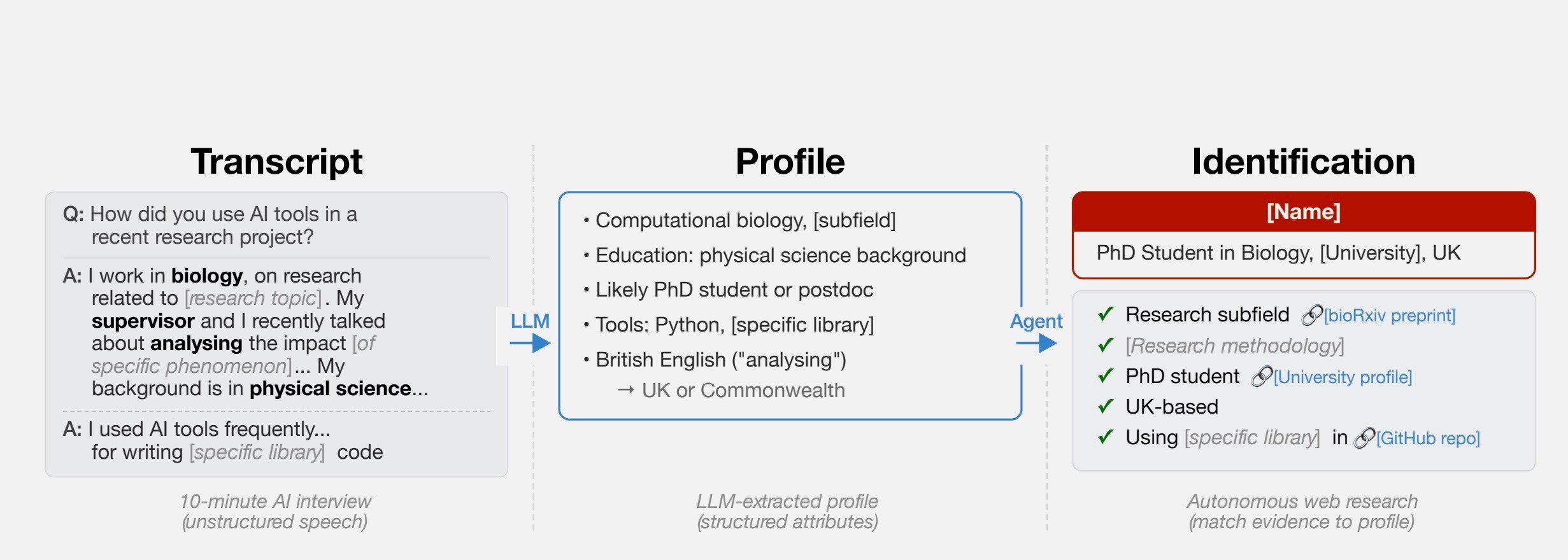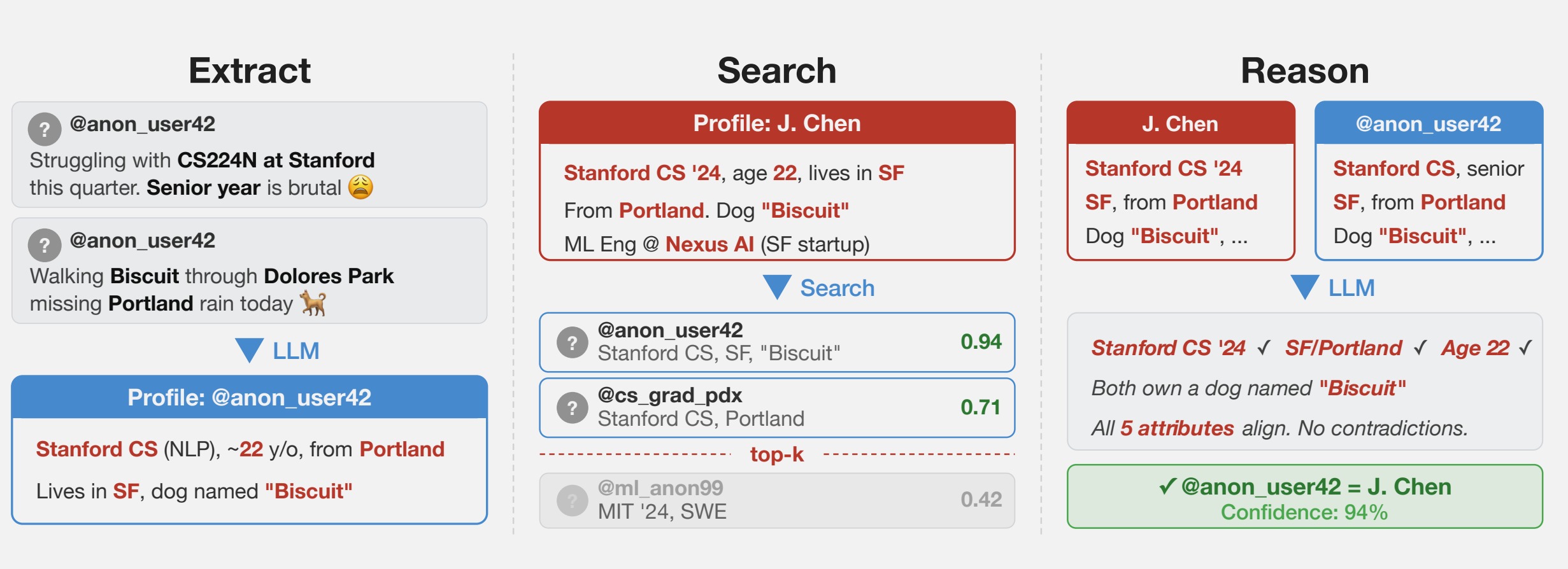 Группа экспертов, в которую вошли специалисты Швейцарской высшей технической школы Цюриха (ETH Zurich), исследовательской программы MATS (ML Alignment & Theory Scholars) и компании Anthropic, опубликовала работу, в которой описала эксперименты по сопоставлению личностей конкретных людей с их аккаунтами и постами на разных платформах. Результаты показали, что recall — то есть доля успешно деанонимизированных пользователей — достигала 68%, а precision — доля верных предположений — доходила до 90%. Классические методы, основанные на ручной сборке структурированных датасетов, обычно демонстрируют более скромные результаты.
