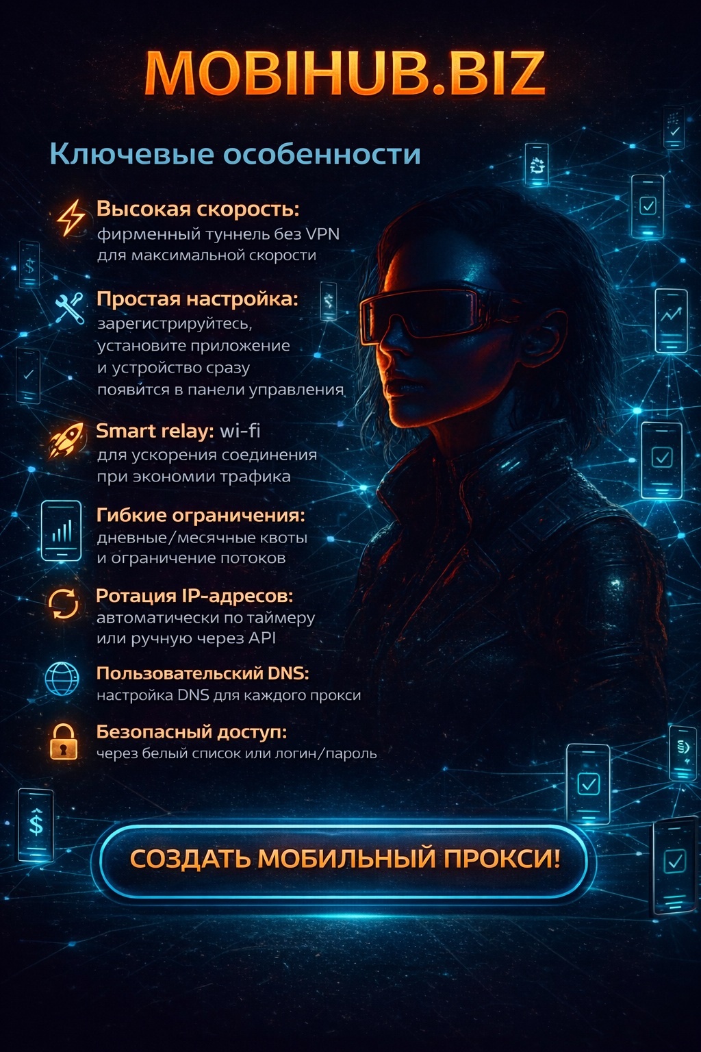 MobiHub — это мощная и при этом простая в использовании платформа, которая превращает любой Android-смартфон в полноценный мобильный прокси. С её помощью вы можете быстро создать собственную ферму мобильных прокси из десятков или даже сотен устройств и управлять всем в одном месте через удобный, интуитивно понятный личный кабинет. Платформа идеально подходит для тех, кто работает с прокси онлайн и стремится получить масштабируемый, централизованный контроль над созданием прокси, управлением лимитами, ротацией IP и всеми операциями с Android-устройствами.