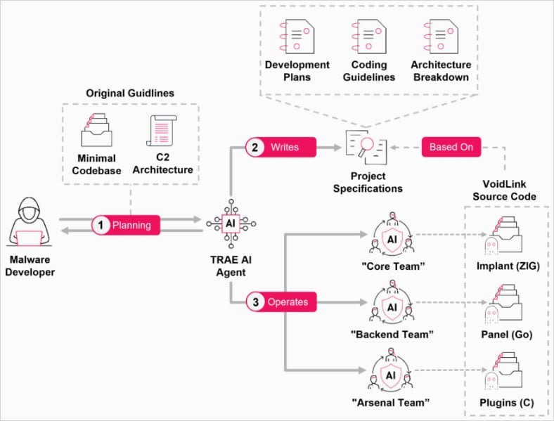 Проведенный анализ показал, что создатель VoidLink использовал SDD (Spec-Driven Development), чтобы определить цели проекта и задать ограничения, а затем поручил ИИ сгенерировать план разработки для нескольких команд. План включал архитектуру, спринты и стандарты. Затем эта документация послужила основой для генерации кода с помощью ИИ.