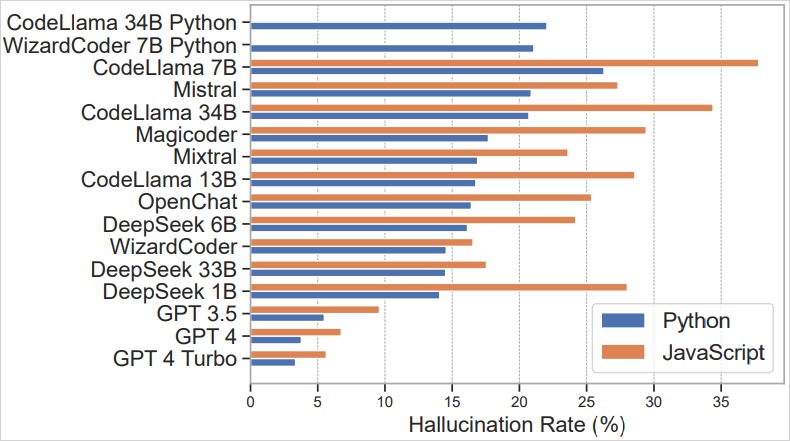 Причем ситуация выглядит хуже для опенсорсных LLM (CodeLlama, DeepSeek, WizardCoder и Mistral), а коммерческие инструменты, такие как ChatGPT-4, галлюцинируют примерно в 5% случаев, что тоже совсем немало.