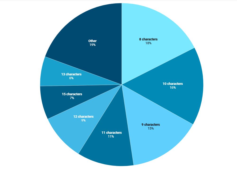 - длина 65,8% проанализированных паролей составила менее 12 символов, и только 3,2% содержали 16 символов и более.