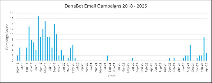 По данным аналитиков Proofpoint, малварь использовалась несколькими крупными хак-группами в период с 2018 по 2020 год и тогда активно распространялась через вредоносные письма. В середине 2020 года DanaBot исчез из списка email-угроз, но в середине 2024 года активность возобновилась. Теперь малварь уже использовала не только письма, но также опиралась на вредоносную рекламу и отравление SEO.