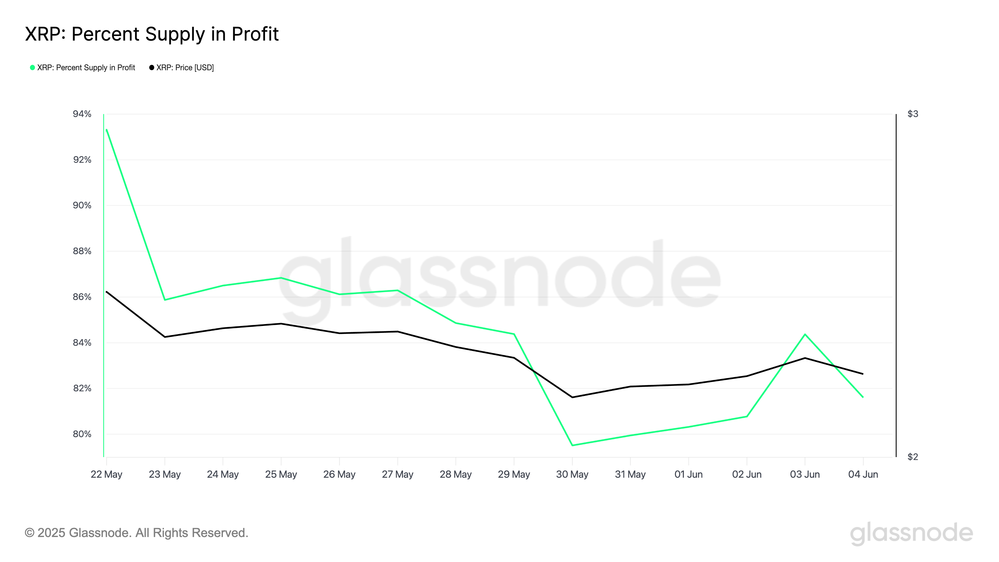 Согласно данным Glassnode, после снижения до многомесячного минимума 79% 31 мая, показатель резко вырос. Сейчас 82% держателей Ripple находятся в нереализованной прибыли. Если это усилит стимул к продаже, может начаться волна распродаж. Она окажет давление на цену и замедлит недавний рост.