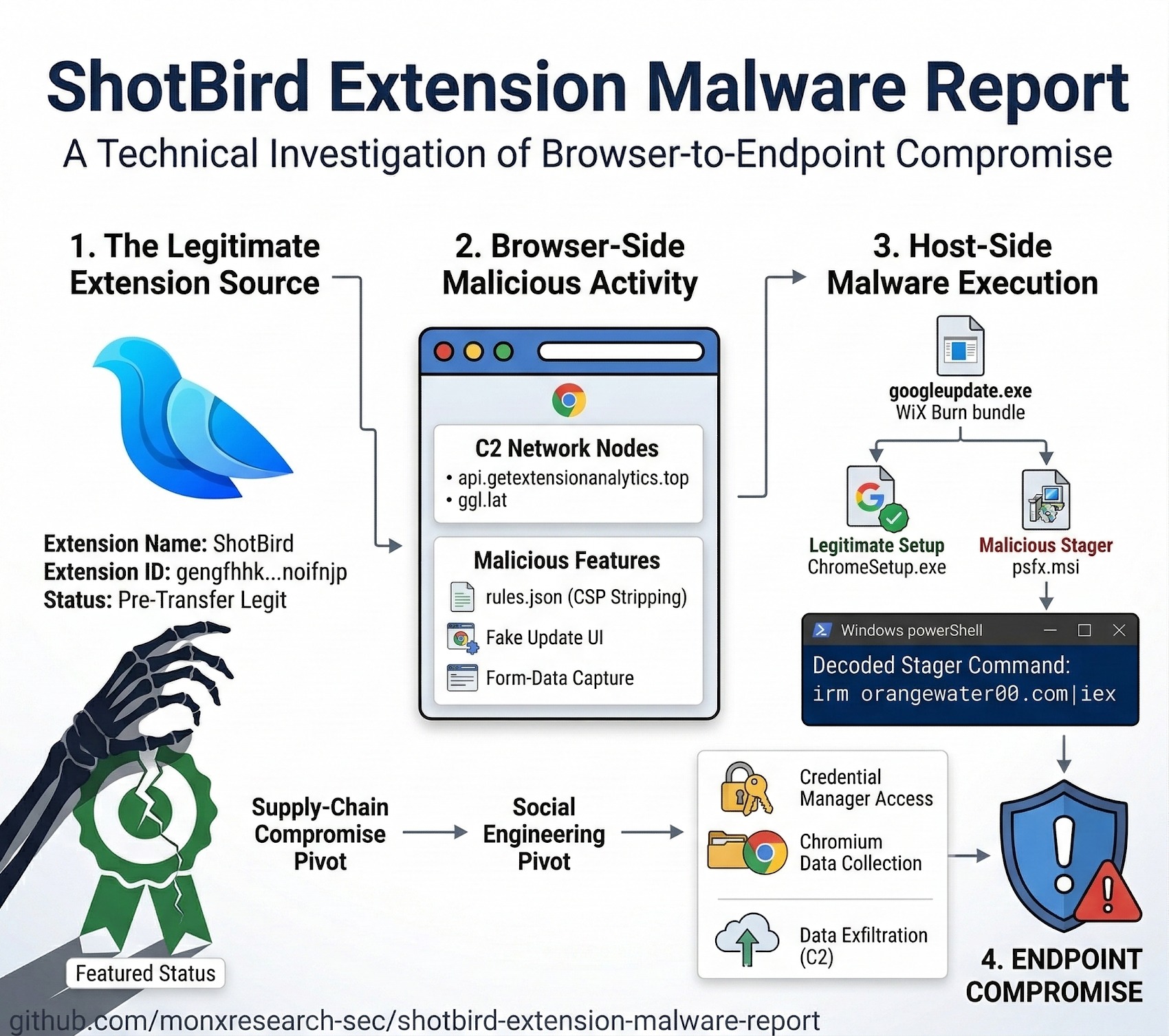 Исследователи предупредили, что два расширения для Chrome (QuickLens и ShotBird) стали вредоносными после того, как их перепродали новым владельцам. Расширения, которые раньше принадлежали разработчику под ником BuildMelon, теперь внедряют произвольный код, собирают пользовательские данные и пытаются распространять малварь через фальшивые обновления.
