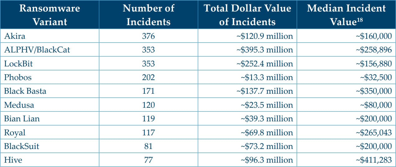 Суммарно в своем отчете аналитики FinCEN выделяют 267 различных семейств вымогательской малвари, но львиная доля атак была совершена всего несколькими ключевыми группировками. Так, по числу упоминаний в отчетах лидирует вымогатель Akira (376 случаев). По полученной «прибыли» впереди всех группировка ALPHV/BlackCat, получившая около 395 млн долларов выкупов. Второе место занимает LockBit с 252,4 млн. Также в топ-10 попали вымогатели Black Basta, Royal, BianLian, Hive, Medusa и Phobos.