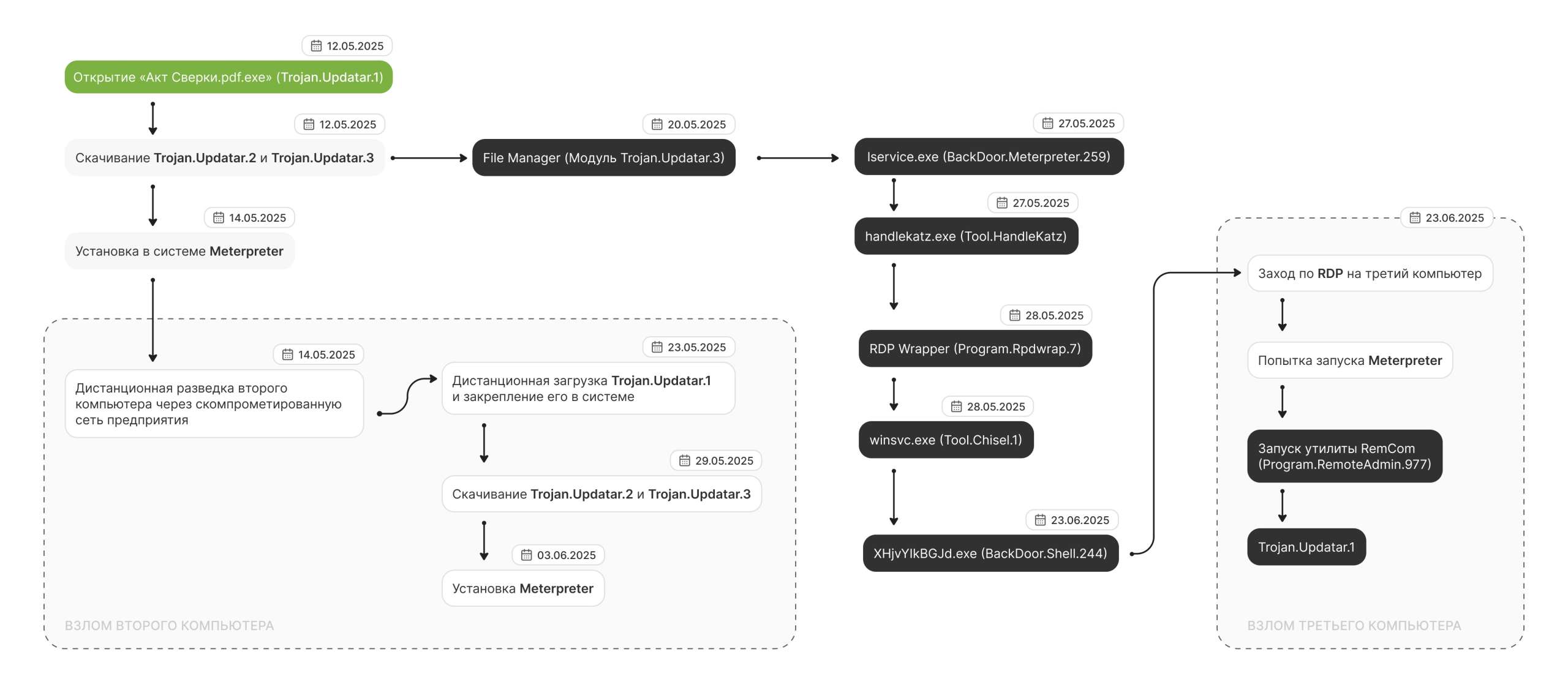 Заражение первого компьютера предприятия произошло 12 мая 2025 года: троян, пришедший в одном из нежелательных писем, запустился при открытии фальшивого документа. Спустя час после заражения он загрузил и установил в систему другие компоненты бэкдора — Trojan.Updatar.2 и Trojan.Updatar.3.