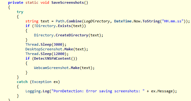 Интересно, что помимо модулей для антианализа, перехвата нажатий клавиш, кражи данных и содержимого буфера обмена, Phantom обладает модулем PornDetector. Он следит за активностью пользователя и, если обнаруживает в активном окне одну из подстрок «porn», «sex», «hentai», «chaturbate», то создает скриншот в файл %LOCALAPPDATA%\[0-9a-f]{32}\logs\nsfw\yyyy-MM-dd\HH[.]mm[.]ss\Desktop_yyyyMMdd_HHmmss.jpg, делает паузу 12 секунд.