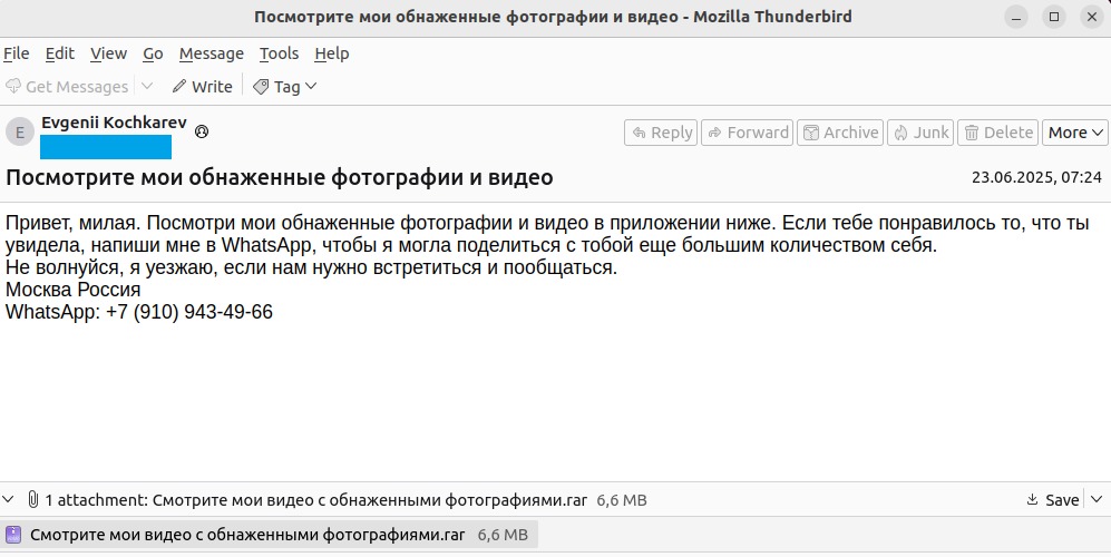 Отмечается, что порой злоумышленники выбирали весьма фривольные темы для своих писем. Например, «See My Nude Pictures and Videos» или «Посмотрите мои обнаженные фотографии и видео». Но также встречались более традиционные для фишеров темы, вроде «Прикрепленная копия платежа №06162025».