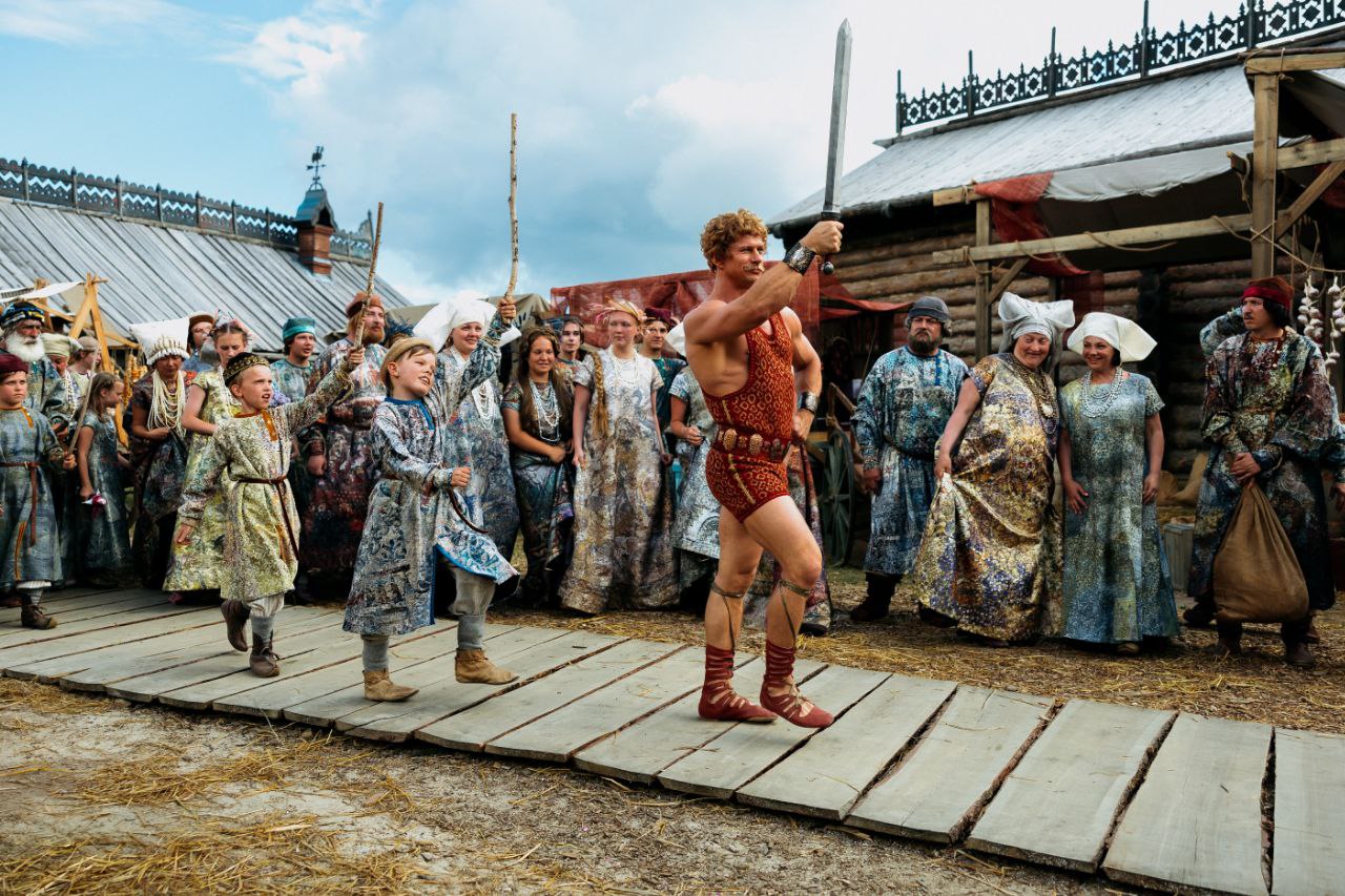 Актёры стараются, и это чувствуется. Александр Петров в своей привычной роли «простого парня с добрым сердцем» — на месте, не раздражает, а даже вызывает симпатию. Сергей Маковецкий в образе князя — как всегда шикарен, с фирменной улыбкой и лёгкой самоиронией. Виктория Агалакова очень милая, и с её появлением на экране сразу становится теплее. А силач Бамбула (Роман Курцын) — вообще отдельная история, его песню дочка потом напевала весь вечер. Отдельное уважение — создателям Горыныча. Малыш-дракон получился реально классным: живой, смешной, с характером. И хотя его в кадре не так много, каждая сцена с ним вызывает улыбку. Видно, что над графикой поработали — для отечественного кино это прям достижение. Даже сцена подводного погружения в начале фильма сделана добротно, без ощущения дешёвых эффектов.