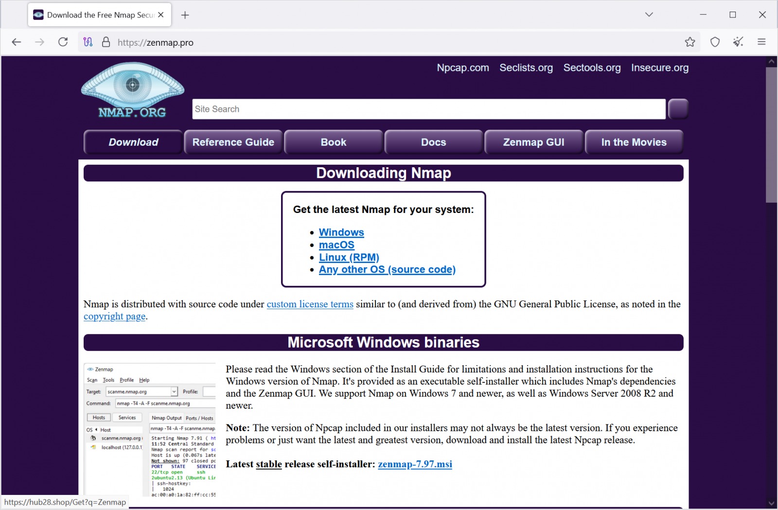 Если же пользователя перенаправили на zenmap[.]pro из результатов поиска, он видит клон легитимного сайта утилиты nmap (Network Mapper).