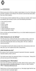 Скомпрометированные данные, попавшие в руки хакеров, включают:«С сожалением сообщаем, что один из наших партнеров подвергся кибератаке, в результате которой с его системы были похищены персональные данные части клиентов Renault UK», — говорится в уведомлении компании.