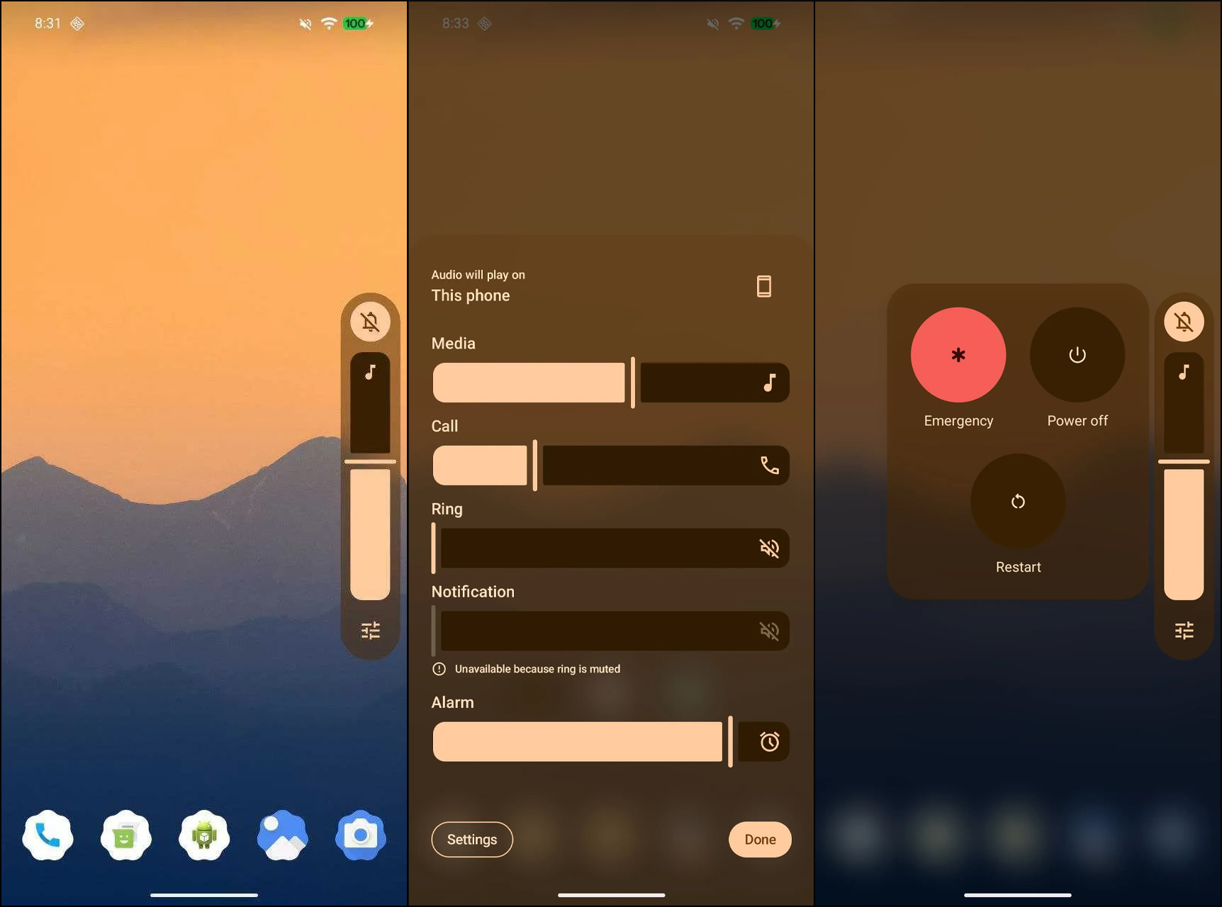 На примере ползунка громкости видно, что разработчики Android решили отказаться от сплошных светлых и тёмных подложек в пользу полупрозрачного «материала». Он подстраивается под динамические цвета, а ещё через него могут просвечиваться обои рабочего стола. Заодно изменился значок контекстного меню на панели регулировки громкости: вместо трёх точек теперь используется более наглядная иконка.