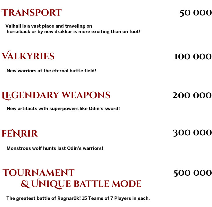Разработчики поставили еще несколько целей, помимо минимальной, хотя их достижение находится под большим вопросом. К примеру, если проект получит более $50 тыс., обещают добавить возможность путешествовать по Вальхалле на лошади или драккаре, а взятие самого верхнего рубежа в $500 тыс. позволяло бы рассчитывать на турнир по VALHALL и уникальный боевой режим.