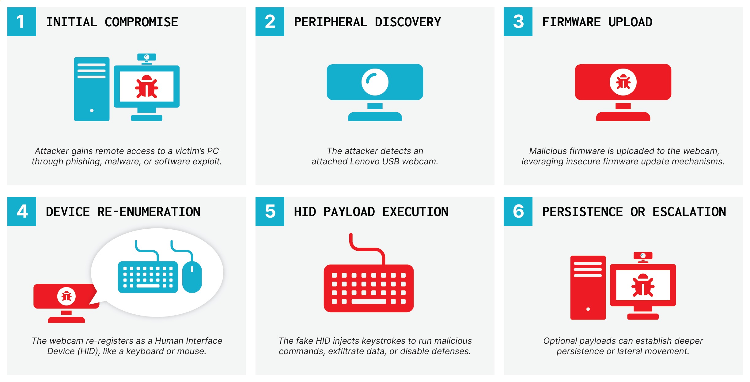 Эксперты компании Eclypsium показали на DEF CON 33 атаку под кодовым названием BadCam, которая эксплуатирует уязвимости в некоторых моделях веб-камер Lenovo, превращая их в орудия для удаленных атак типа BadUSB.