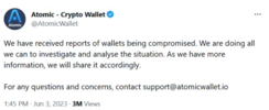 «Мы получили сообщения о взломе кошельков. Мы делаем все возможное, чтобы расследовать и проанализировать ситуацию. Как только у нас будет больше информации, мы поделимся ею соответствующим образом», — заявила команда Atomic на своей странице в Твиттере 3 июня.