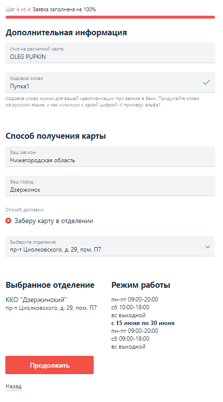 5. Задаете кодовое слово и выбираете удобный для получения карты адрес, жмякаете "Продолжить".